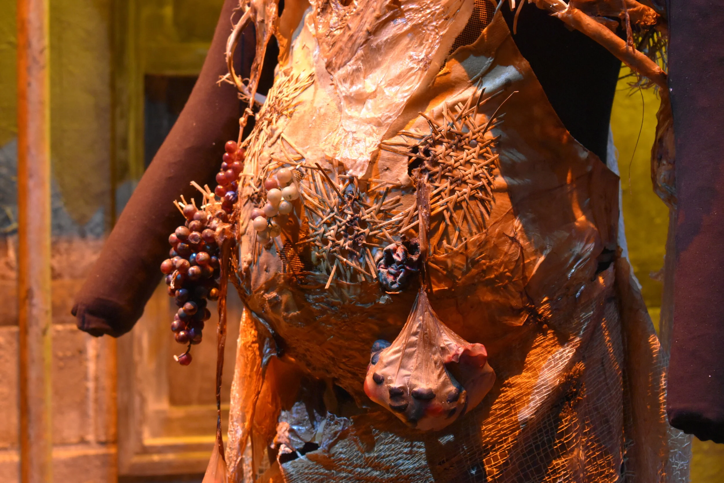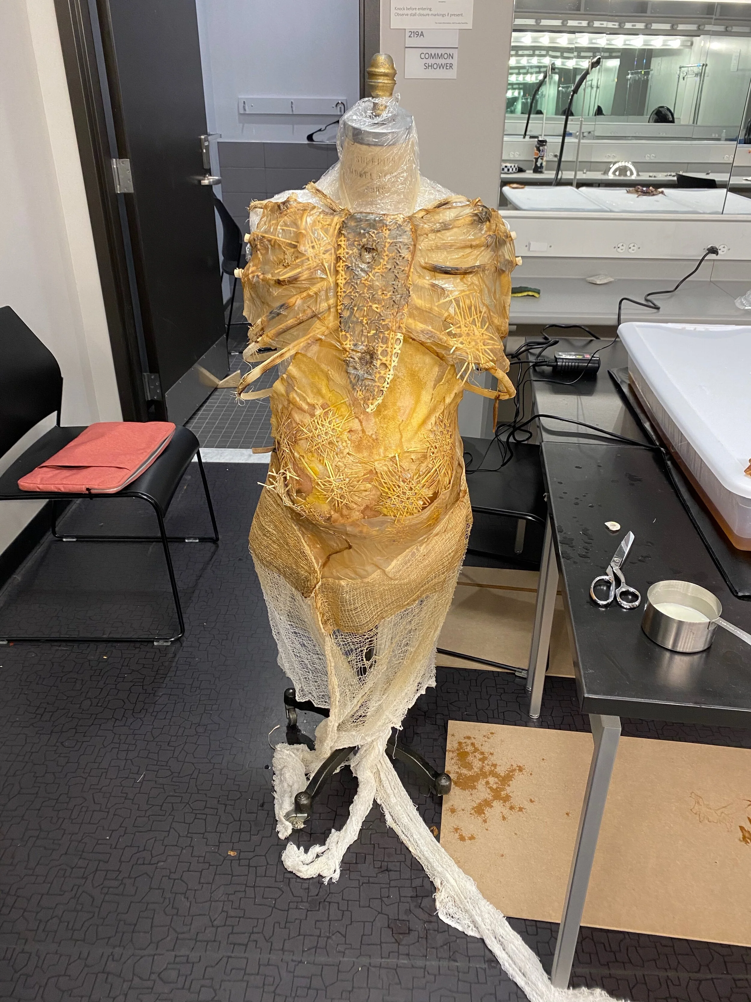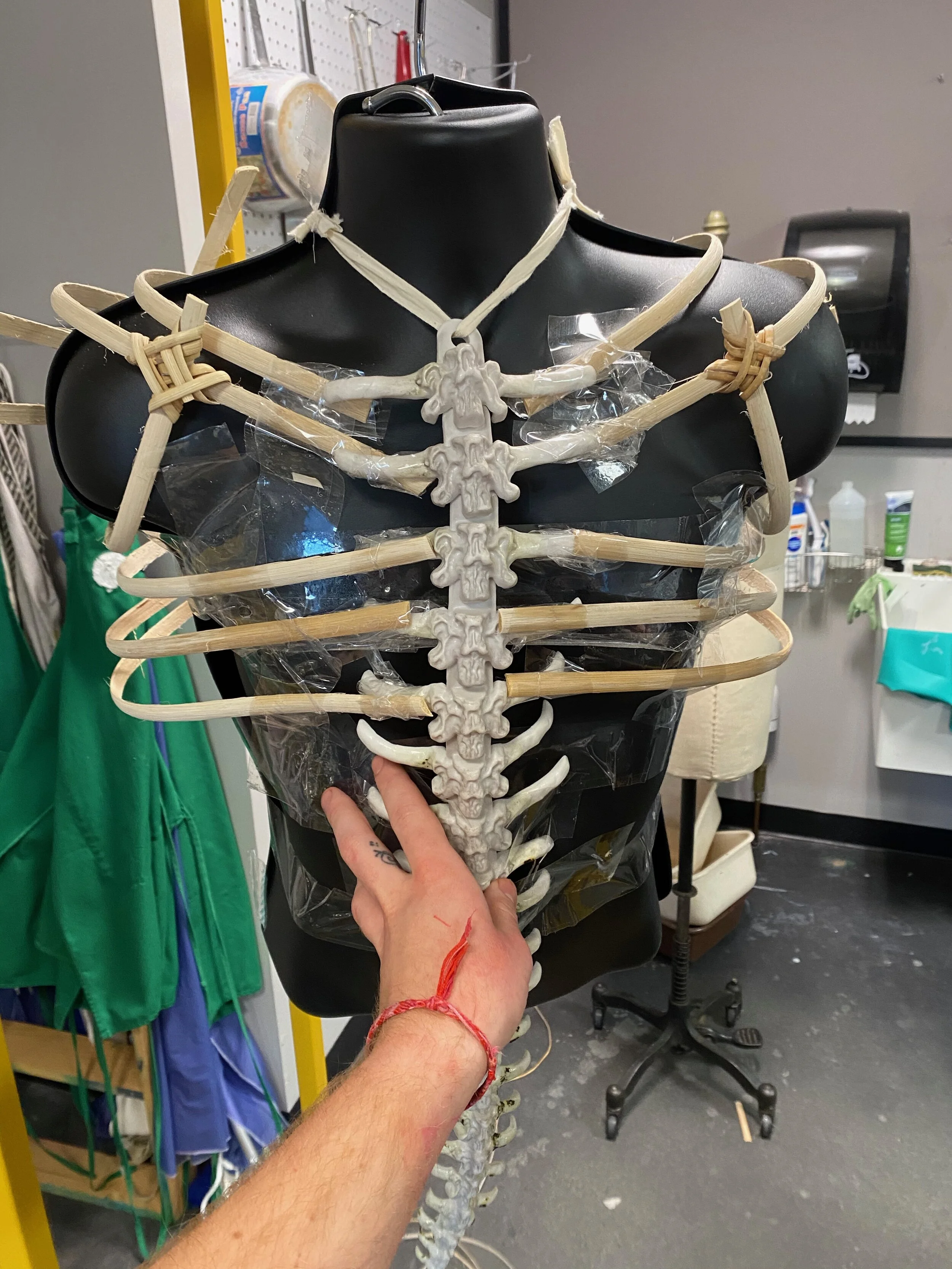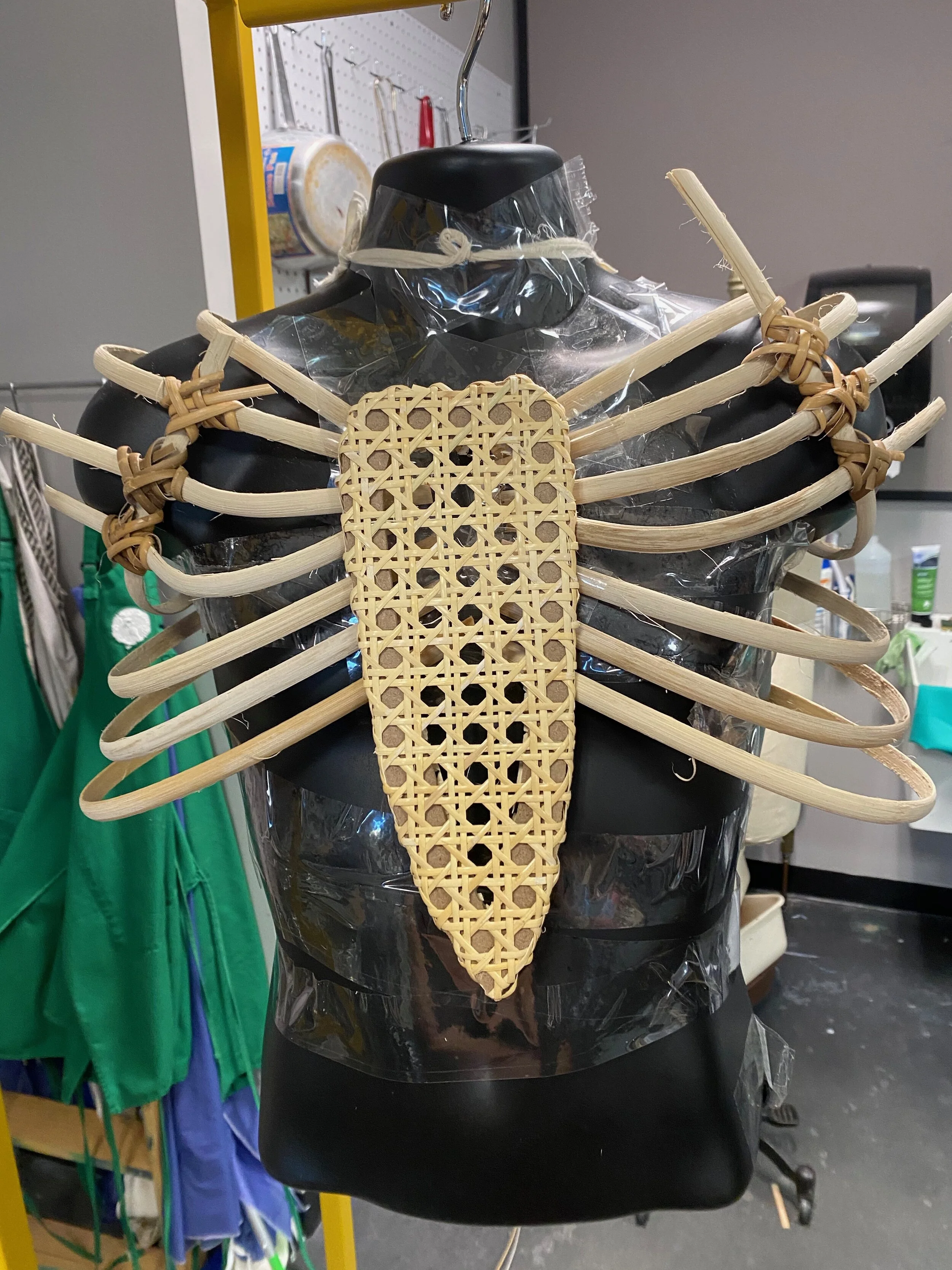 This project was made from mostly sustainable resources. The ribcage was made from cane used for chair caning, and I met with local chair caners to learn this skill. I also grew kombucha leather which you can see is used throughout the garment, the kombucha farm is featured below.