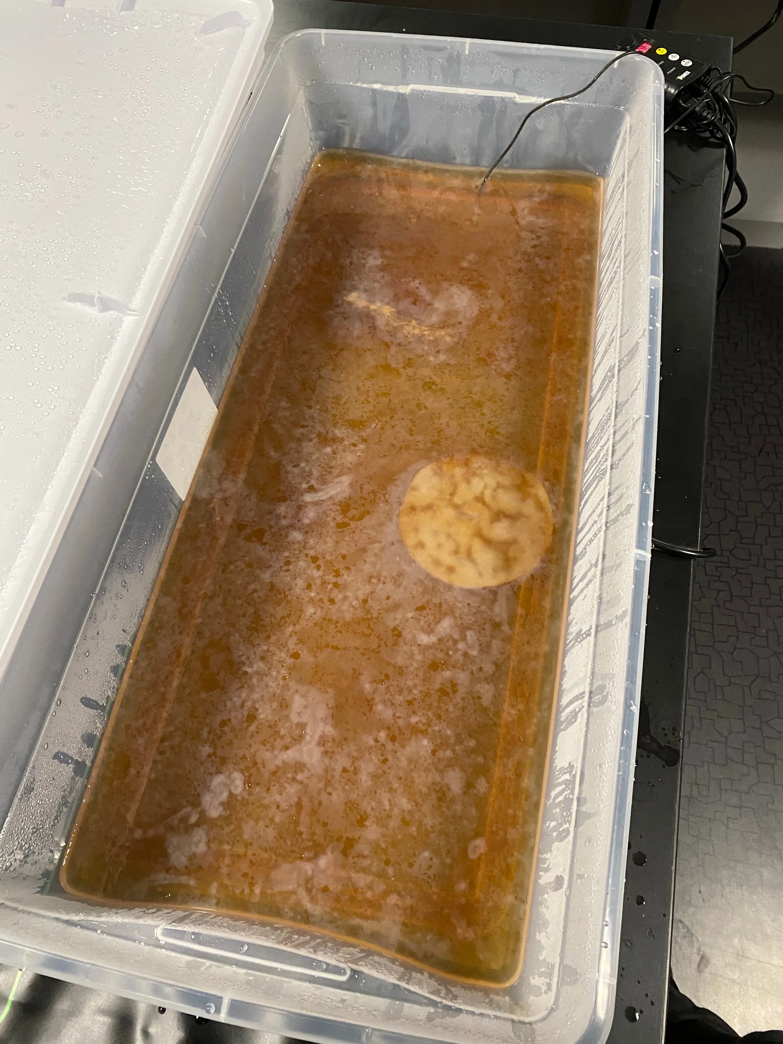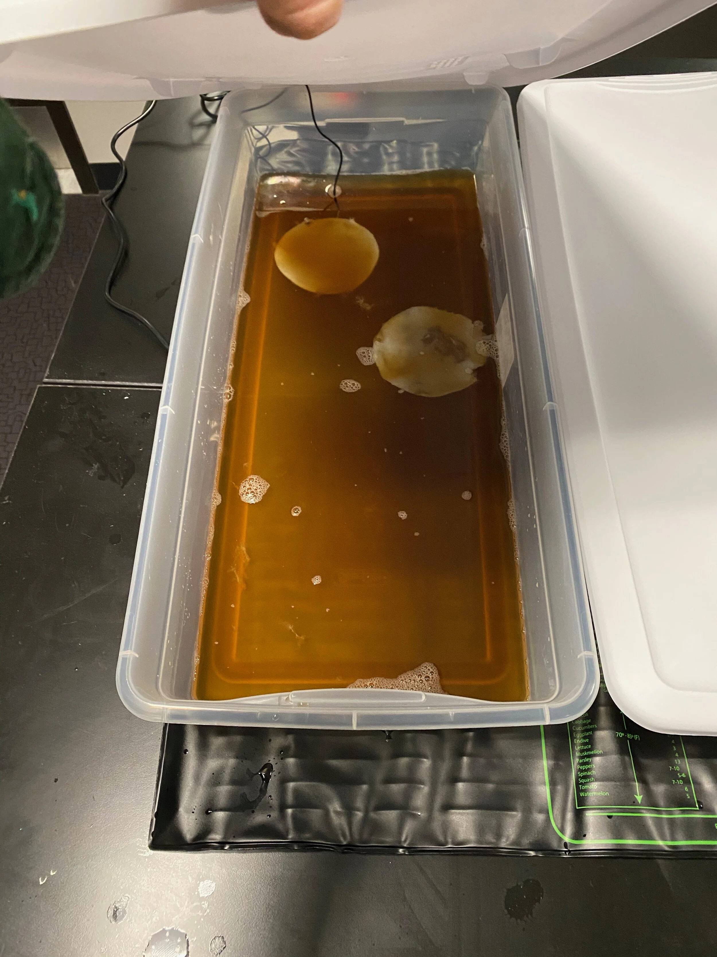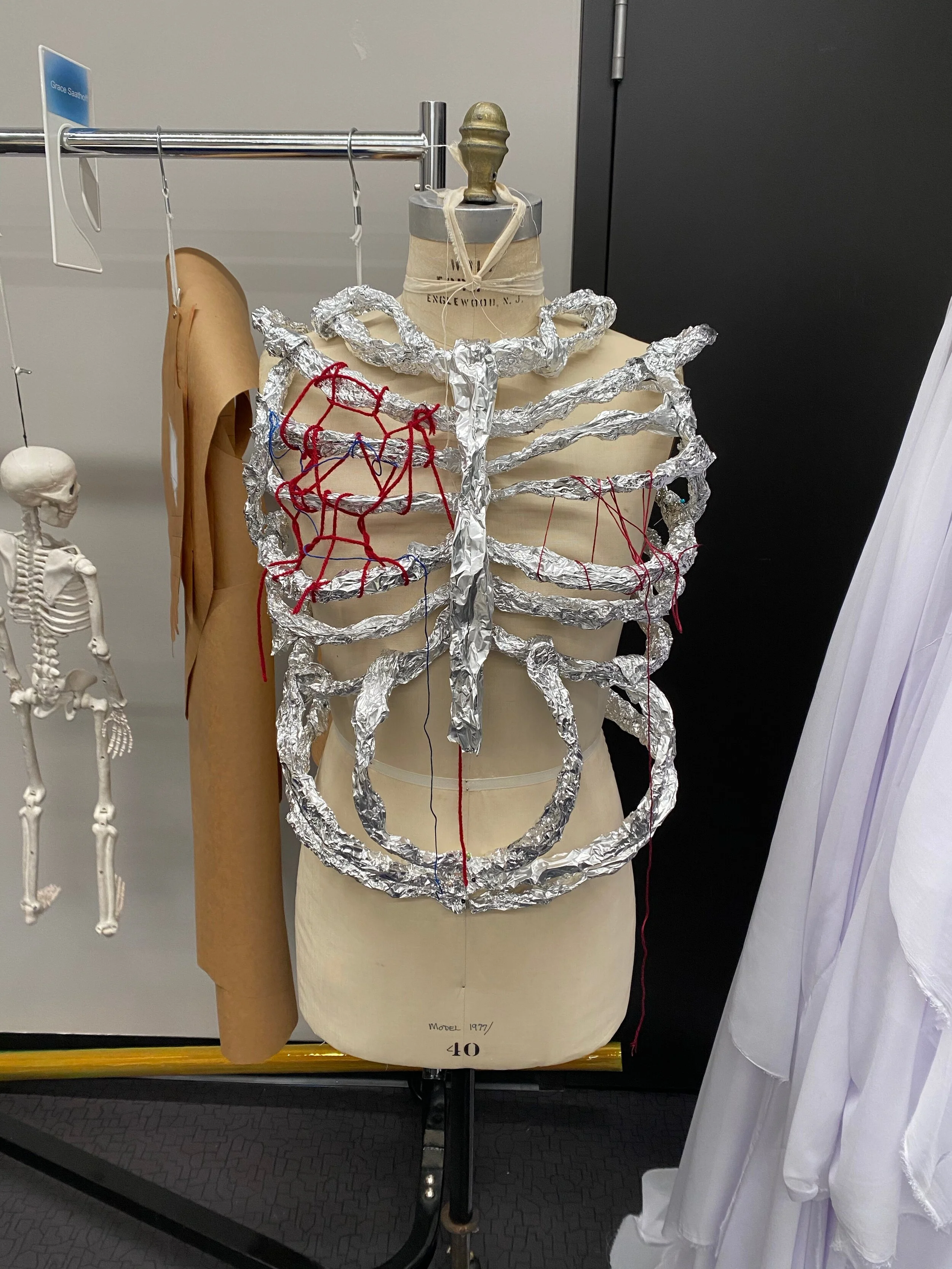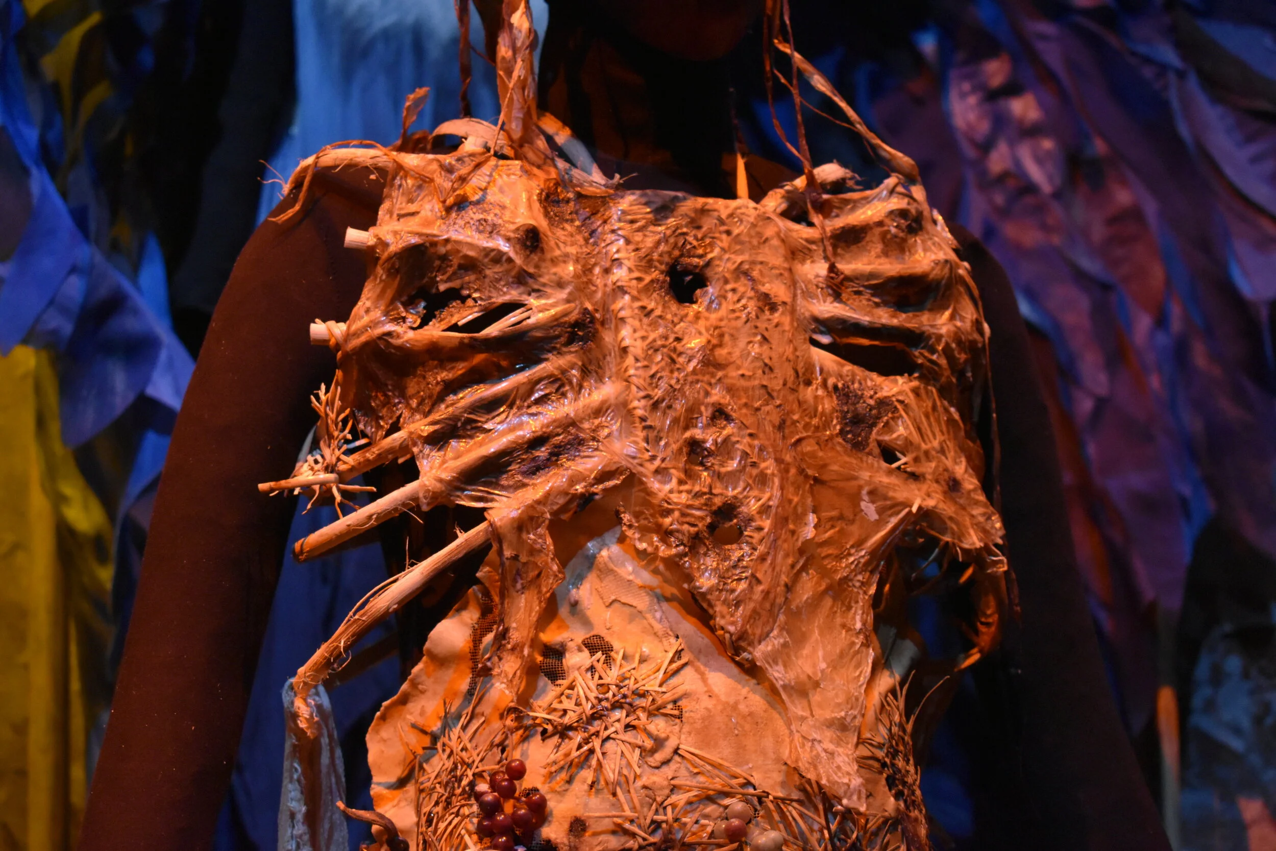 This project was made from mostly sustainable resources. The ribcage was made from cane used for chair caning, and I met with local chair caners to learn this skill. I also grew kombucha leather which you can see is used throughout the garment, the kombucha farm is featured below.